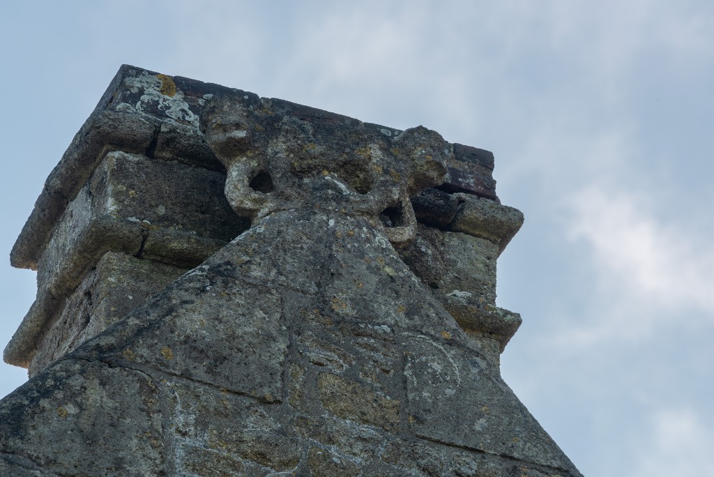 Logis haut, fin 15e - début 16e siècle. Pignon découvert. Détail des deux lions sculptés au faîte du pignonImmatriculation