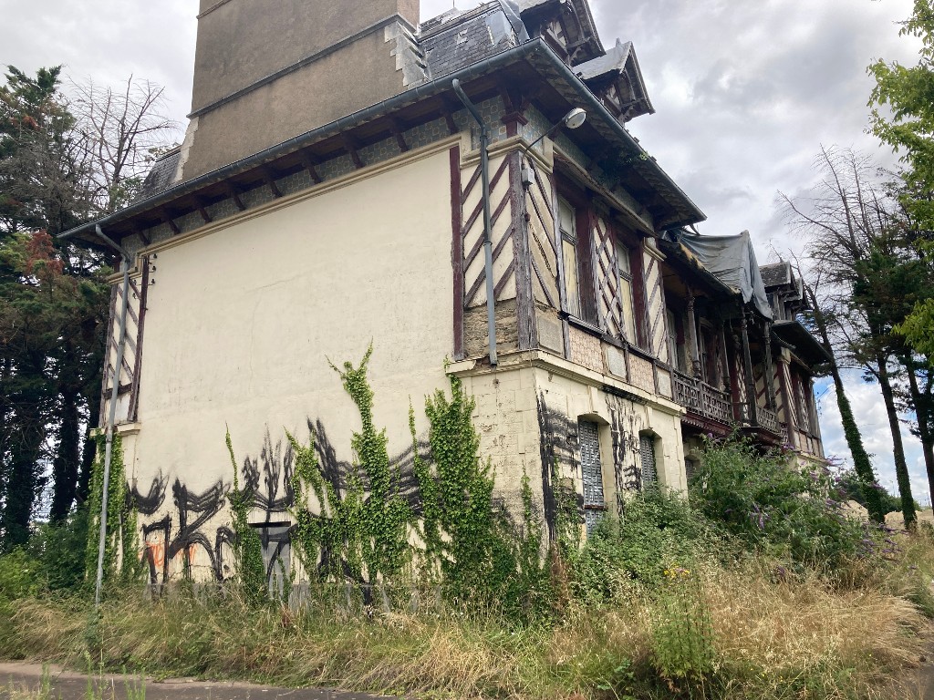 Vue de la façade ouest et sud avec décor de grès (état en 2024)Immatriculation