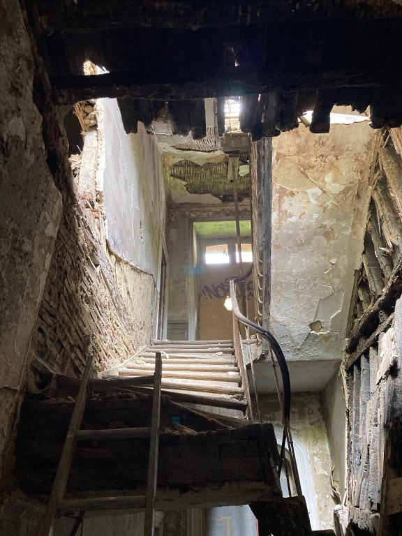 Vue intérieure avec l'escalier en contre-plongée (rez-de-chaussée, au centre de la bâtisse) (état en 2024)Immatriculation