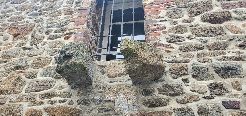 Vue rapprochée sur deux pierres en saillie du mur gouttereau Sud (2024).Immatriculation