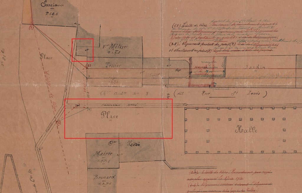 Extrait du plan d'alignement de 1922 avec une mise en évidence de l'absence du porche démoli en 1890.Immatriculation