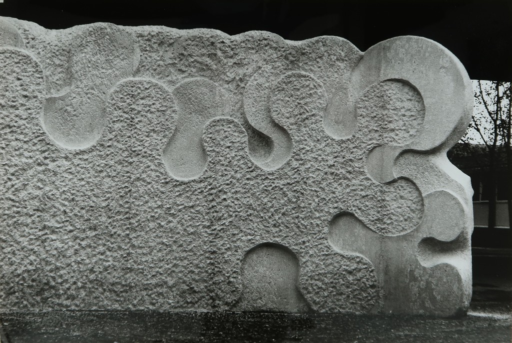 Yasuo Mizui, "Coupe-vent", mur sculpté en pierre de Lacoste, 1976, photographié peu après sa réalisation. Détail.Immatriculation