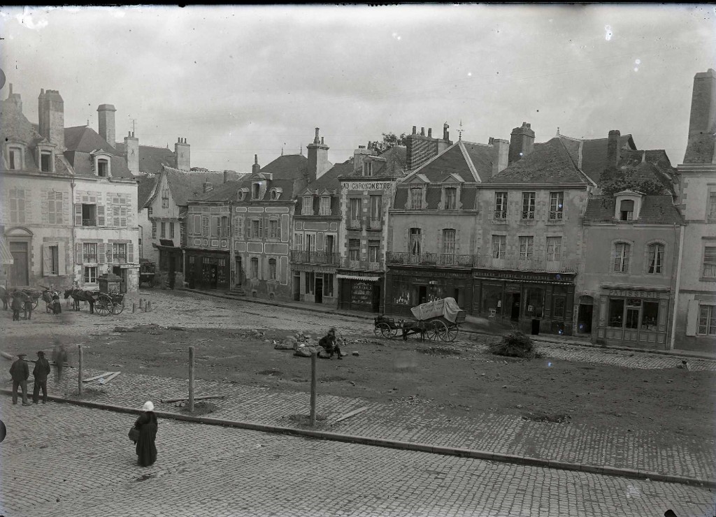 54 place de la République : maison en pan de bois avec encorbellement visible en arrière plan.Immatriculation