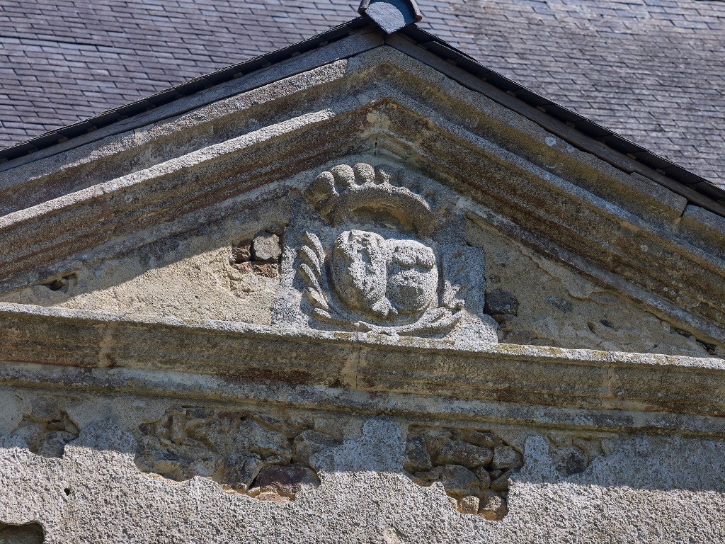 Façade est, détail sur les armoiries de la famille de Bédée et de Guinguené sur le fronton centralImmatriculation