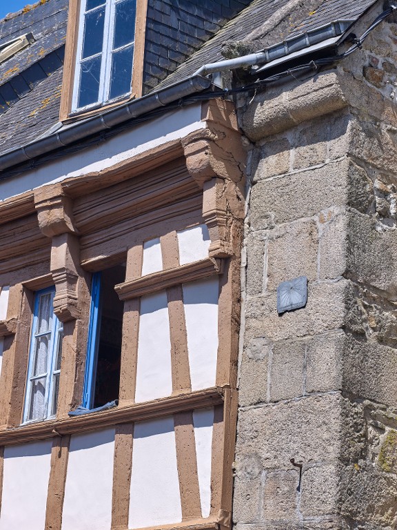 Consoles sculptées et lisses moulurées soulignant l'appui et le linteau des anciennes ouvertures. Cadran solaire en ardoise cloué sur le mur pignon.Immatriculation