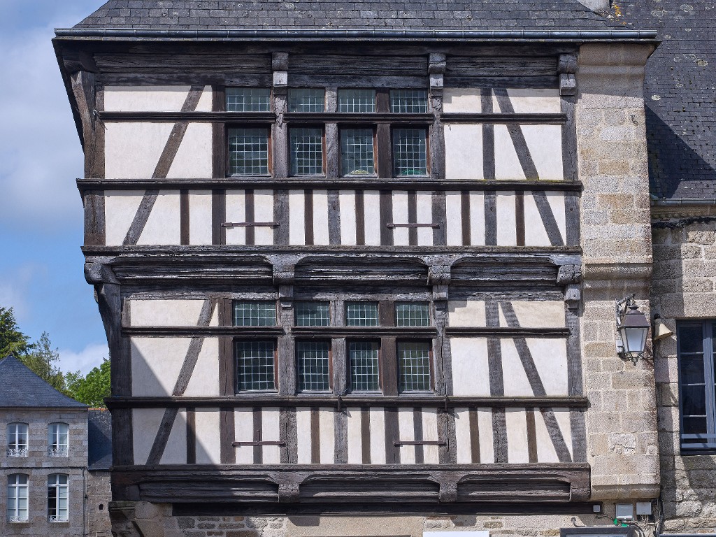 Façade en pan de bois donnant sur la place. Le contreventement se compose d'écharpes, poteaux et potelets.Immatriculation