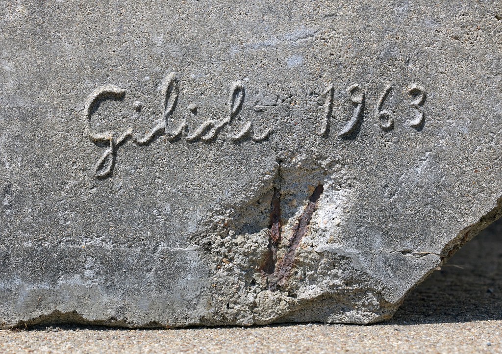 Émile Gilioli, sculpture en béton, 1963. Détail sur la signature et la date.Immatriculation