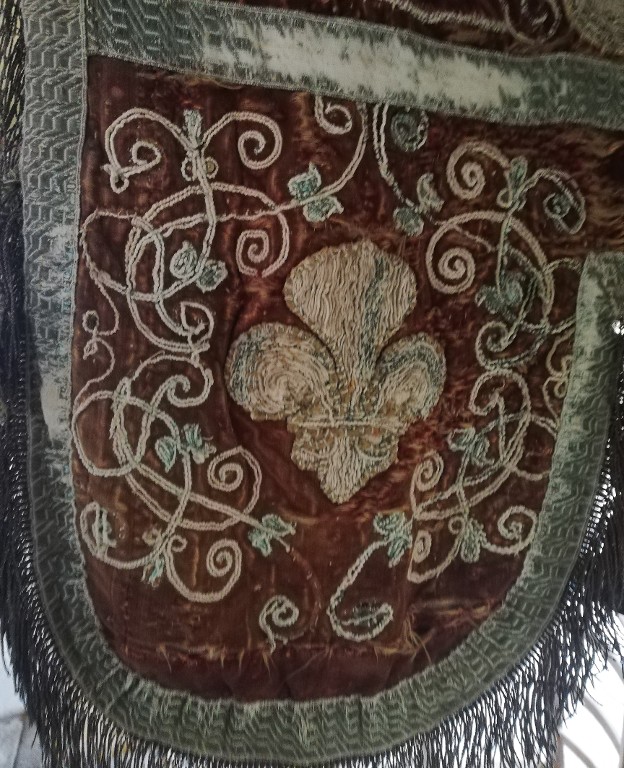 Détail face Assomption : feston brodé d'une Fleur de LysImmatriculation