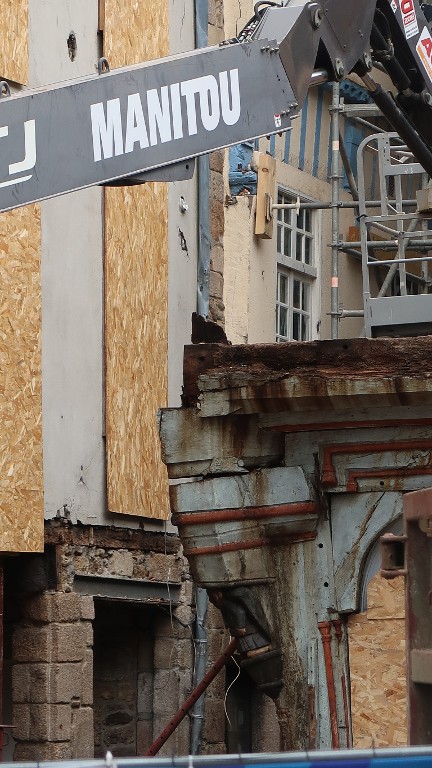 La maison en cours de démolition après son incendie en 2019. Etat du poteau cornier portant Saint-Dinan.Immatriculation