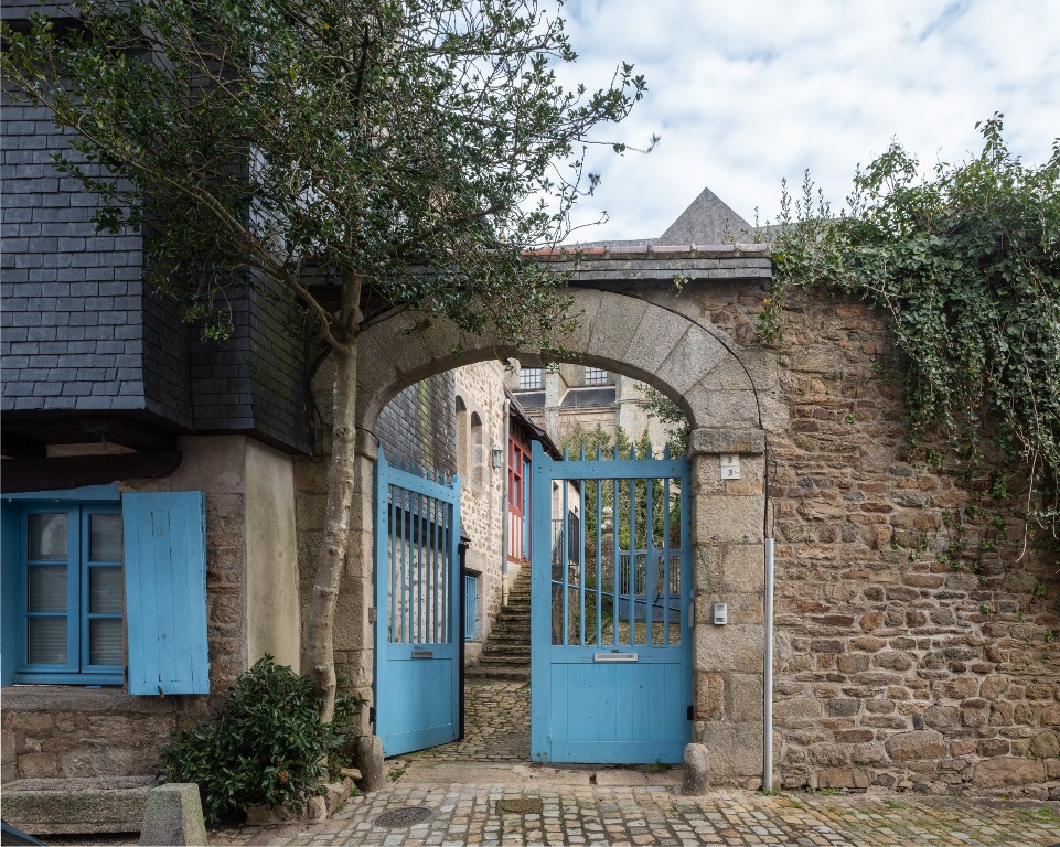 Grand portail d'entrée jouxtant l'édifice en pan de bois.Immatriculation