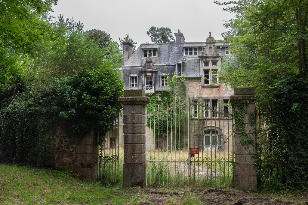 Vue générale du château de Kerhuon depuis le nord-est. Au premier plan, son entrée avec porte charretière entourée de deux portes piétonnesImmatriculation