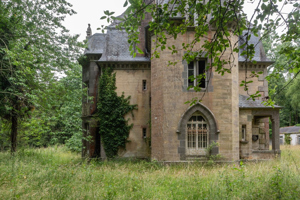Vue du château de Kerhuon depuis le sud-est : élévation sud-est (état en 2025). La fenêtre en arc brisé est de style néo-médiévalImmatriculation