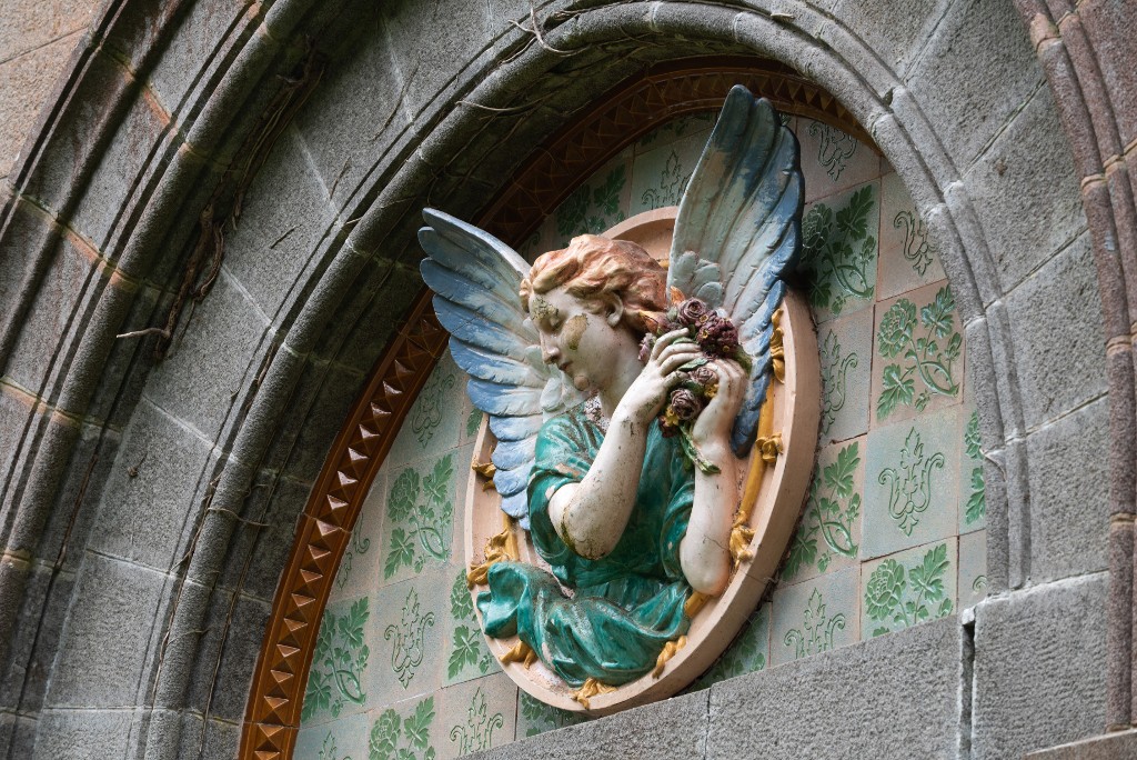 Vue de détail du château de Kerhuon : élévation nord-ouest, tympan de la porte (état en 2025). Il est orné d'un ange aux ailes déployées tenant dans ses mains des fleurs sur un fond de carreaux à décor floral et héraldiqueImmatriculation