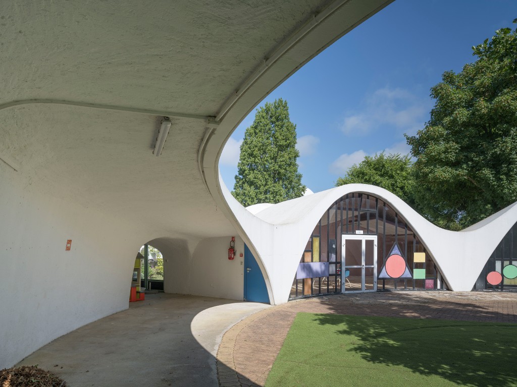 Dans un mouvement très souple, l'anneau de béton se replie sur lui-même pour créer un préau autour de la cour circulaire.Immatriculation