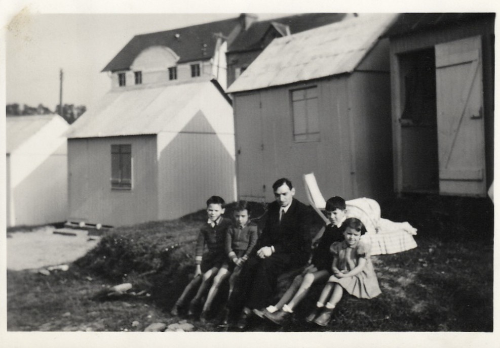 Famille Le Gall et le cabanon familial, plage du Ris,1953.Immatriculation