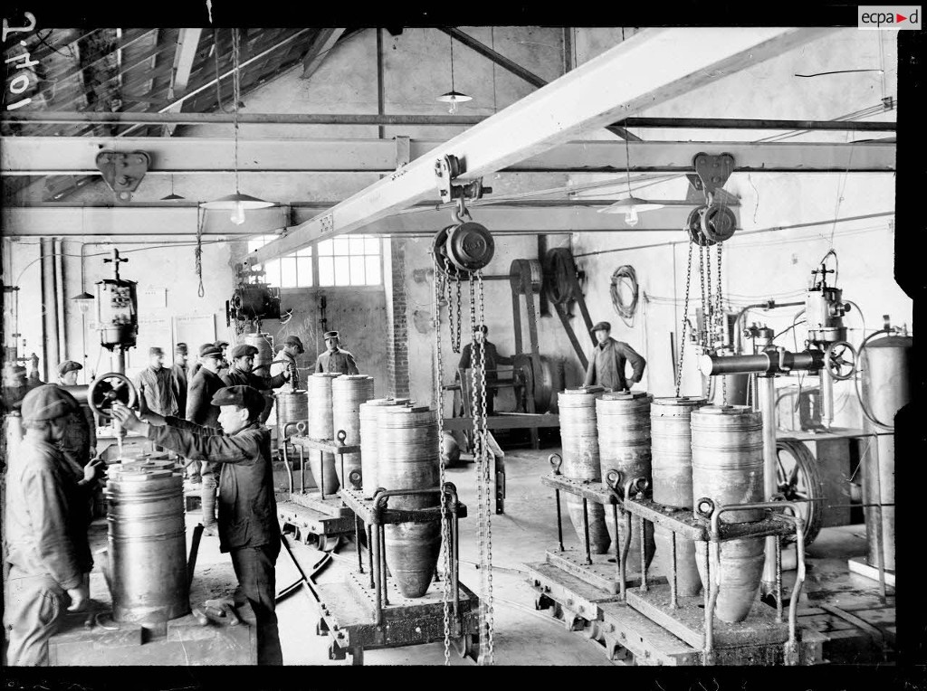 Vue intérieure d'un atelier en 1916 : vissage des bouchons sur des obus de 340 mm. L'équipe est masculine. Cet atelier à charpente métallique avec plusieurs treuils manuels est traversé par deux voies ferrées étroites et doté d'une plaque tournanteImmatriculation