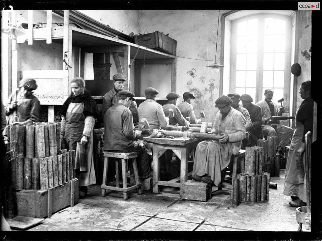 Vue intérieure d'un atelier en 1916 : débosselage des douilles au maillet sur une forme. L'équipe est mixte. Cet atelier est desservi par une voie ferrée étroite dotée d'une plaque tournanteImmatriculation