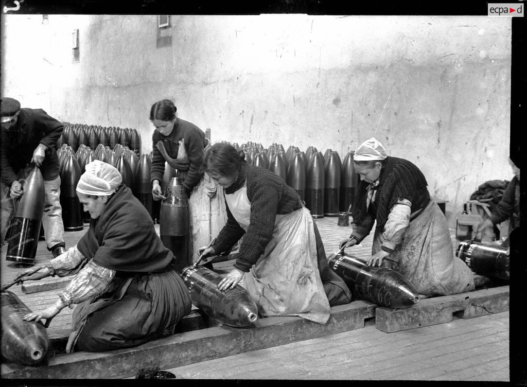 Vue intérieure d'un atelier en 1916 : ouvrières employées à la peinture des obus. Deux femmes portent la coiffe de Brest dite la MarmotteImmatriculation