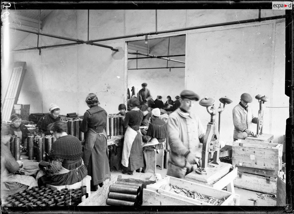 Vue intérieure d'un atelier en 1916 : amorçage, marquage et chargement des douilles de 75 mm. L'équipe est mixte. L'atelier est divisé par une cloison ; suspendu au plafond, un dispositif d'extinction incendieImmatriculation