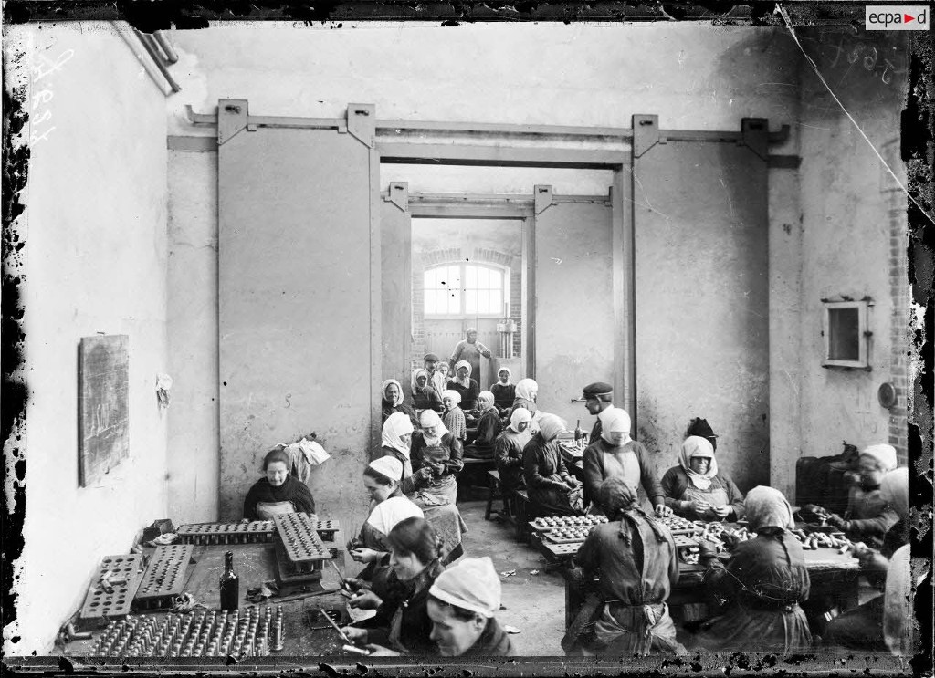 Vue intérieure d'un atelier en 1916 : une majorité de femmes est employée à la peinture au pinceau des fusées d'obus. L'atelier est coupé dans la longueur par des portes coulissantes métalliques ; il est doté d'une porte à linteau en arc segmentaireImmatriculation