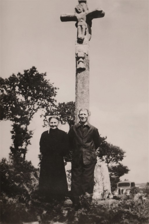 Maria LE COZ et son époux Jean-Marie QUÉRÉ posant devant la croix avec son croisillon (sans date)Immatriculation