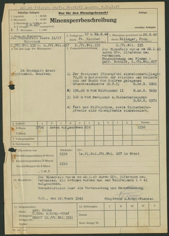 Dossier allemand de minage, commune de Tréflez, champ de mines Elorn II/17 : description du champ de mines nommé Nussbaum (noyer), 22 mars 1943 [1538 engins de type S. Minen + 258 engins]-