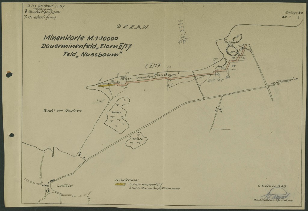 Dossier allemand de minage, commune de Tréflez, champ de mines Elorn II/17 : carte du champ de mines nommé Nussbaum (noyer), 22 mars 1943 [1538 engins de type S. Minen + 258 engins]