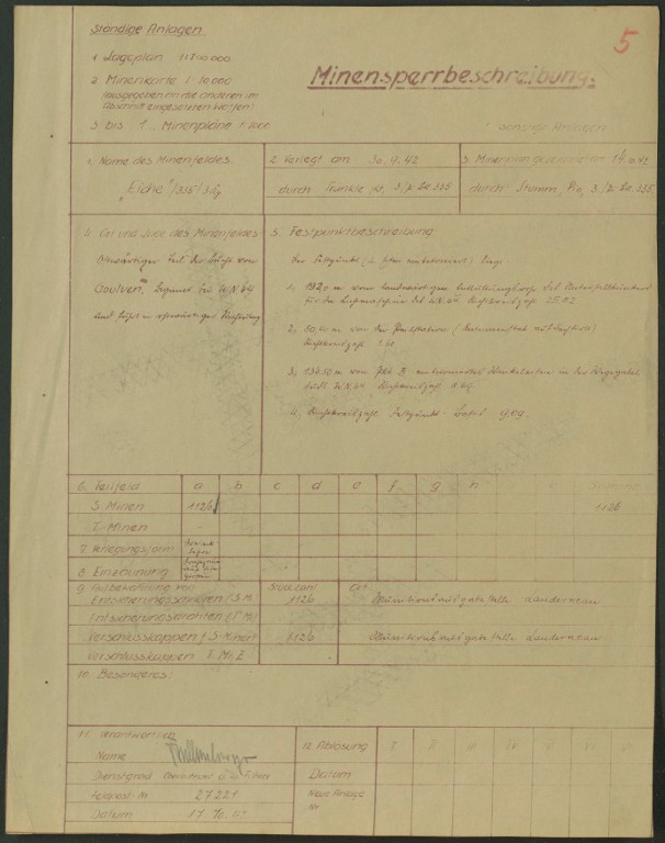 Dossier allemand de minage, communes de Tréflez et de Plounévez-Lochrist, champ de mines Elorn II/30 : description du champ de mines nommé Eiche (chêne), 17 octobre 1942 [1126 engins de type S. Minen]-