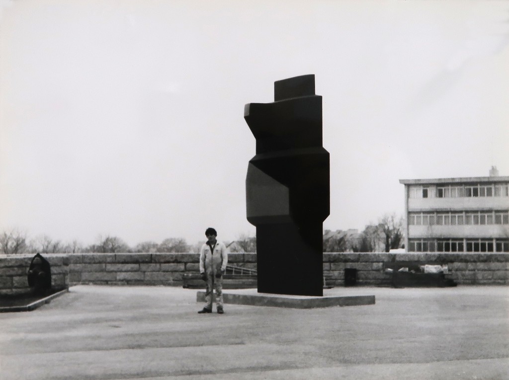 Emile Gilioli, sculpture en tôle (disparue). Cliché pris lors de sa mise en place (1968).Immatriculation