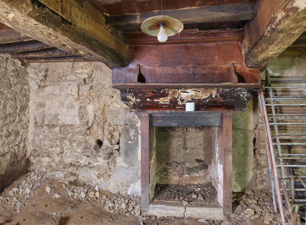Logis sud. Pignon sud. Cheminée ancienne en pierre derrière l'habillage moderne en boisImmatriculation
