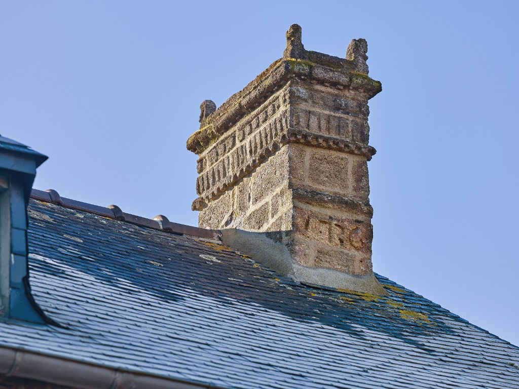 Logis. Souche de cheminée datée 1736, ornée d'un décor sculpté de denticules, de cannelures et de ronds, sommée de boulesImmatriculation