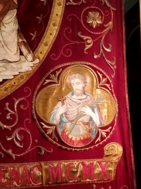 Bannière de procession paroissiale : Christ enseignant avec Sainte Famille, saint André, église Saint-André (Renac),