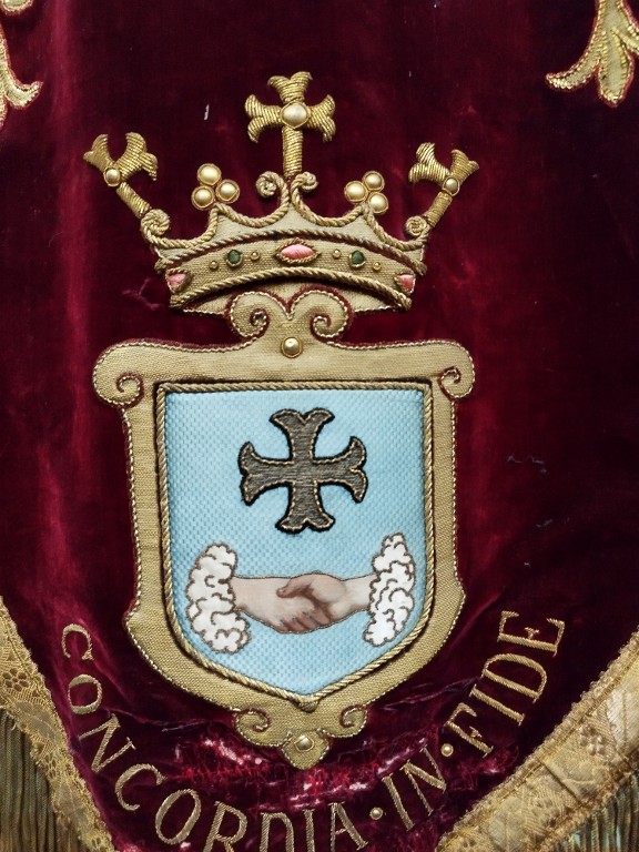 Bannière de procession : Collège Saint-Sauveur, Association catholique des anciens élèves, chapelle des congrégations, lycée Saint-Sauveur (Redon),