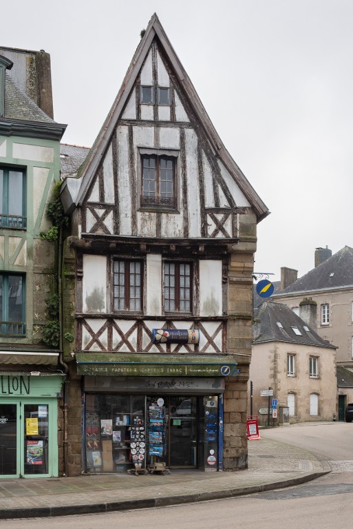 Façade à pignon sur rue en pan de bois, encadrée par des murs à ressauts.Immatriculation