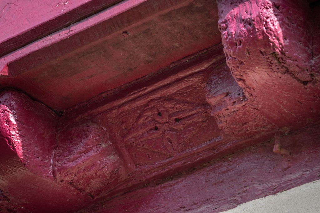 Losange avec motif sculpté sur le chanfrein d'une entretoise.Immatriculation