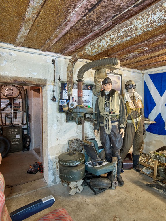 Vue intérieure : système de ventilation et de filtration avec ventilateur de 1,2 m3, filtre dépoussiéreur et tuyauterie d'origine en place (les filtres, posés au sol, sont rapportés). Dans ce bunker-musée, la thématique est l'aéronautiqueImmatriculation
