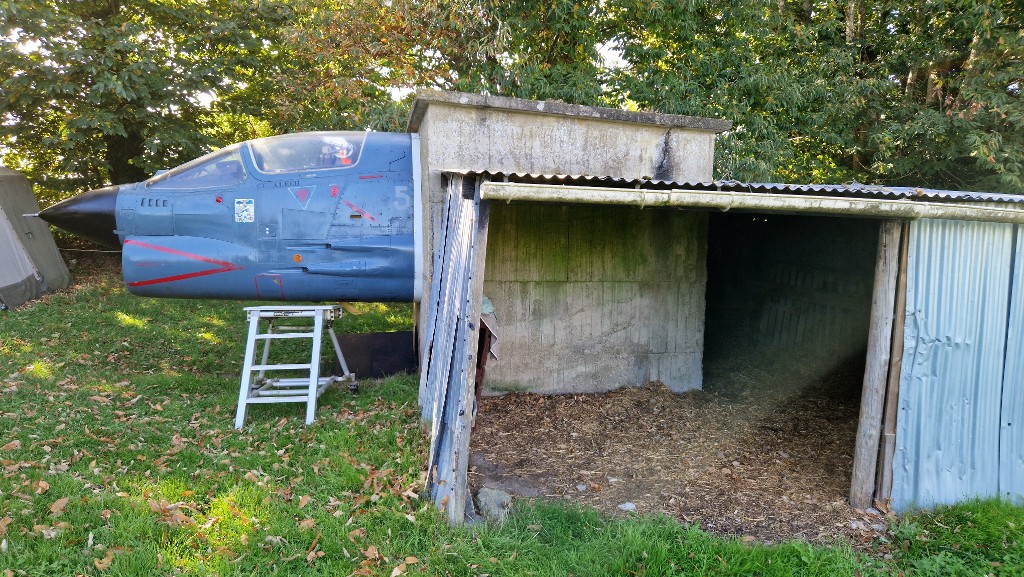 Vue générale. La pointe avant et le cockpit d'un avion de chasse américain Crusader de la flottille 12F de Landivisiau ont été accrochés au bunker-transformateur. Sur le transformateur est également adossé une étable couverte en tôle onduléeImmatriculation
