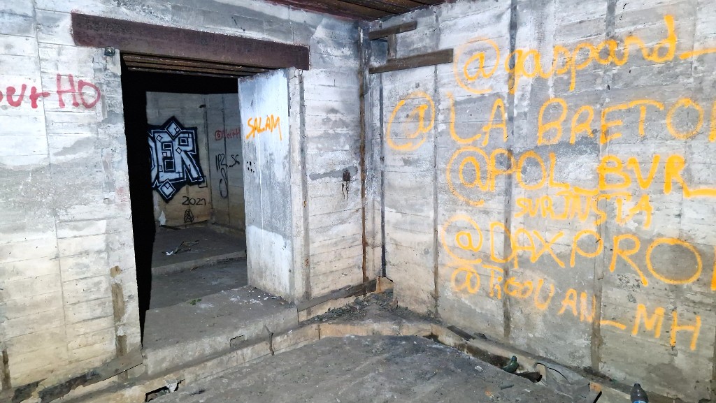 Vue intérieure : poste de calcul (au fond, la salle de garde). Les murs sont couverts de graffitisImmatriculation