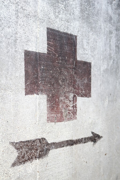 Vue intérieure : flèche peinte en noir et croix rouge indiquant l'infirmerieImmatriculation