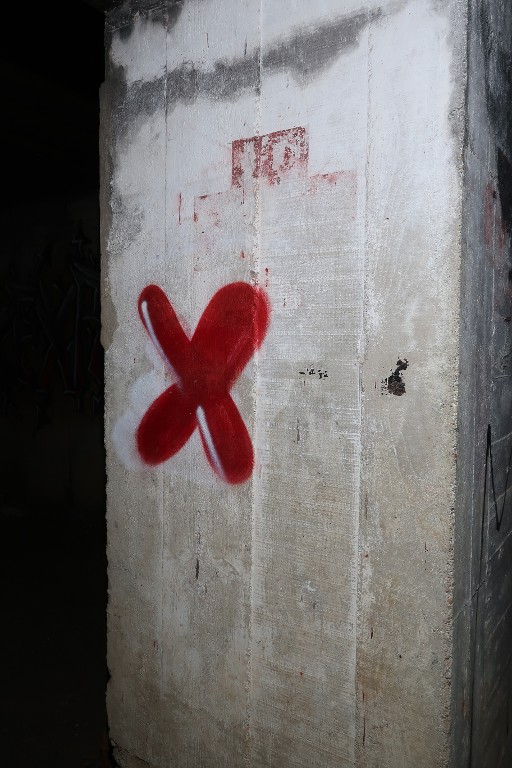 Vue intérieure : traces d'une flèche peinte en noir et croix rouge indiquant l'infirmerie. Les murs sont couverts de graffitisImmatriculation
