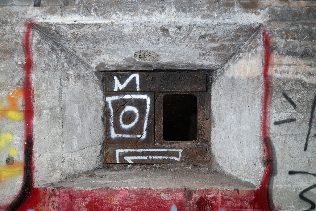 Vue de l'ouverture de tir protégée par un volet blindé depuis la salle de garde nord. Elle servait à protéger l'entrée nordImmatriculation