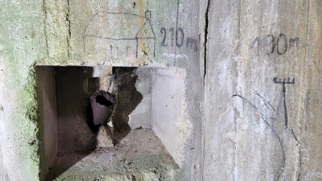 Vue intérieure du bunker-abri de type 621 pour un groupe de combat : poste d'observation. Sur le mur est peint un panorama de tir. Dans la petite niche murale, se trouve un tuyau acoustique relié à la salle de gardeImmatriculation
