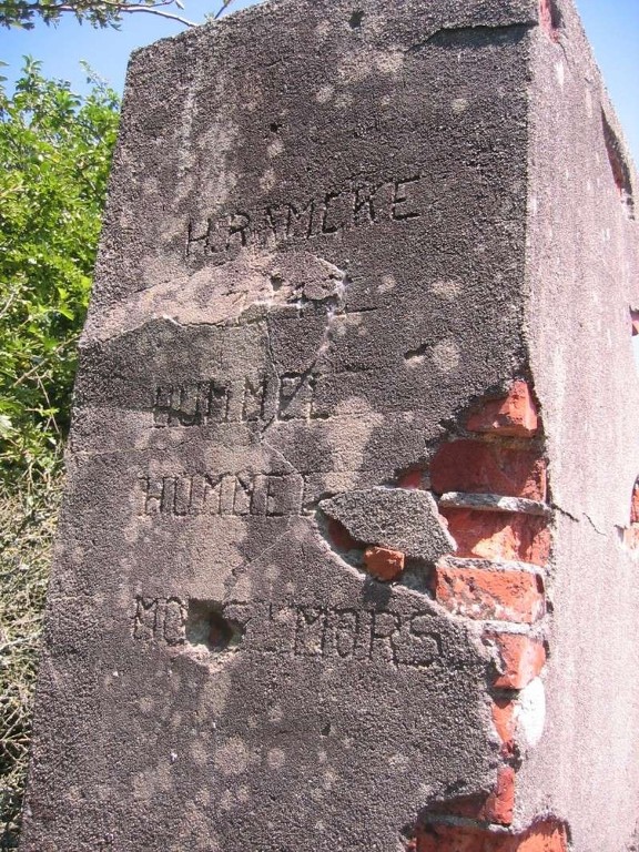Vue du baraquement-cuisine-logement du cuisinier : souche de cheminée avec son inscription et millésime : H.RAMCKE/1942/HUMMEL/HUMMEL/MORS MORS (avant mise en peinture, source : Atlantikwall Superforum. Le Mur de l'Atlantique en France. Bunkerarchéologie)Immatriculation