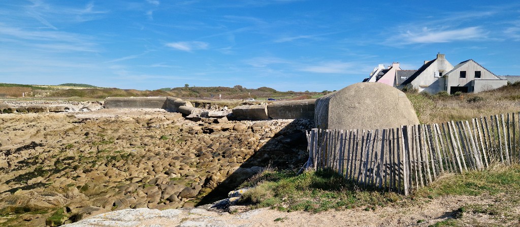 Vue générale depuis le sud de la grève. Des sections de mur sont couchées sur la grève du côté de la mer. A droite, les maisons de la pointe du CourégantImmatriculation
