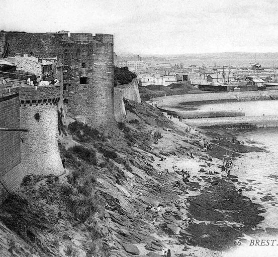 Vue des fortifications d'agglomération de Brest : fossés secs, bastions couronnés d'échauguettes et courtine, demi-lune (côté Recouvrance) dite pointe des Blagueurs. Carte postale